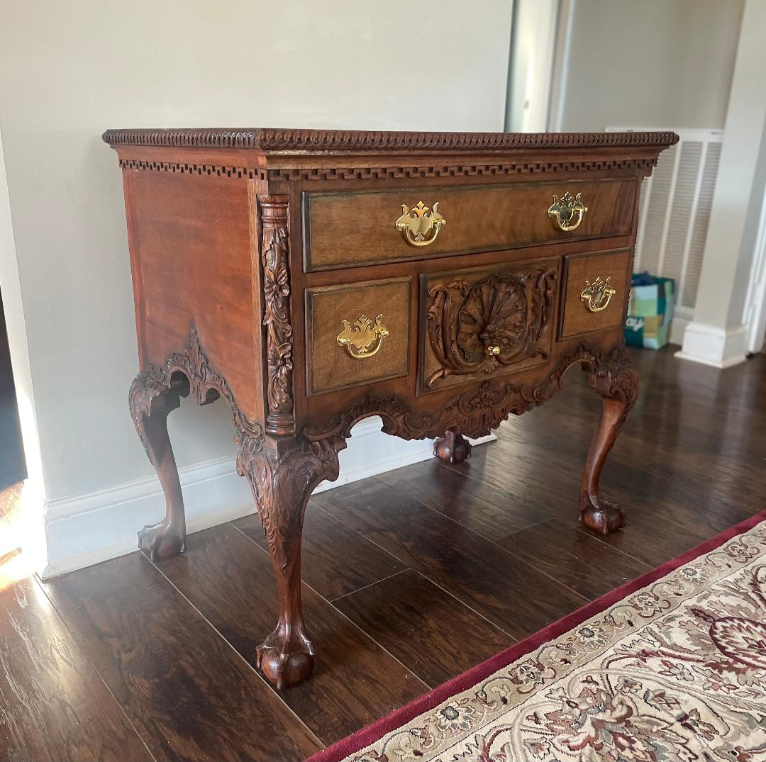 his is a project I had wanted to do for over a year. Since I started woodworking at the end of 2021, while working at an antique mall in Nashville, the pieces that really stood out to me were the ornately carved ones. I also have become enamored with the Chippendale style, with its Uniformity and stately appearance. So when I first saw this piece by the Garvan carver, I knew that’s the one I wanted to complete. The perfect balance between elegance, embellishment and uniform design. The piece is constructed all with hand cut joinery. Mortise and tenons, haunched tenons, different lap joints, dovetails and half blinds, etc. The primary wood used is mahogany. Which made carving a dream. Since there are so many detailed components, about 80% of the whole project was carving. Carving the cabriole legs, ball and claw feet, side panels, front rail, integration, shell and acanthus drawer, quarter columns, and guilloche pattern. There’s also turned quarter pieces which complete the columns. I finished with a mixed dye stain to give the depth but also warmth of the appearance. I also applied sediment glazing to deepen the carvings and give a haloed effect to seem Patinaed. Then I finished with a bit of shellac and pumice powder. Finally with multiple rubbed coats of shellac. From day one of milling up lumber to the last day of applying the finish coat of shellac and hardware it took 40 days in total. It was a humbling but amazingly enjoyable project. You can really see the artistry of the original makers design come to life the further you go into the project. And the end result was worth every moment of work.