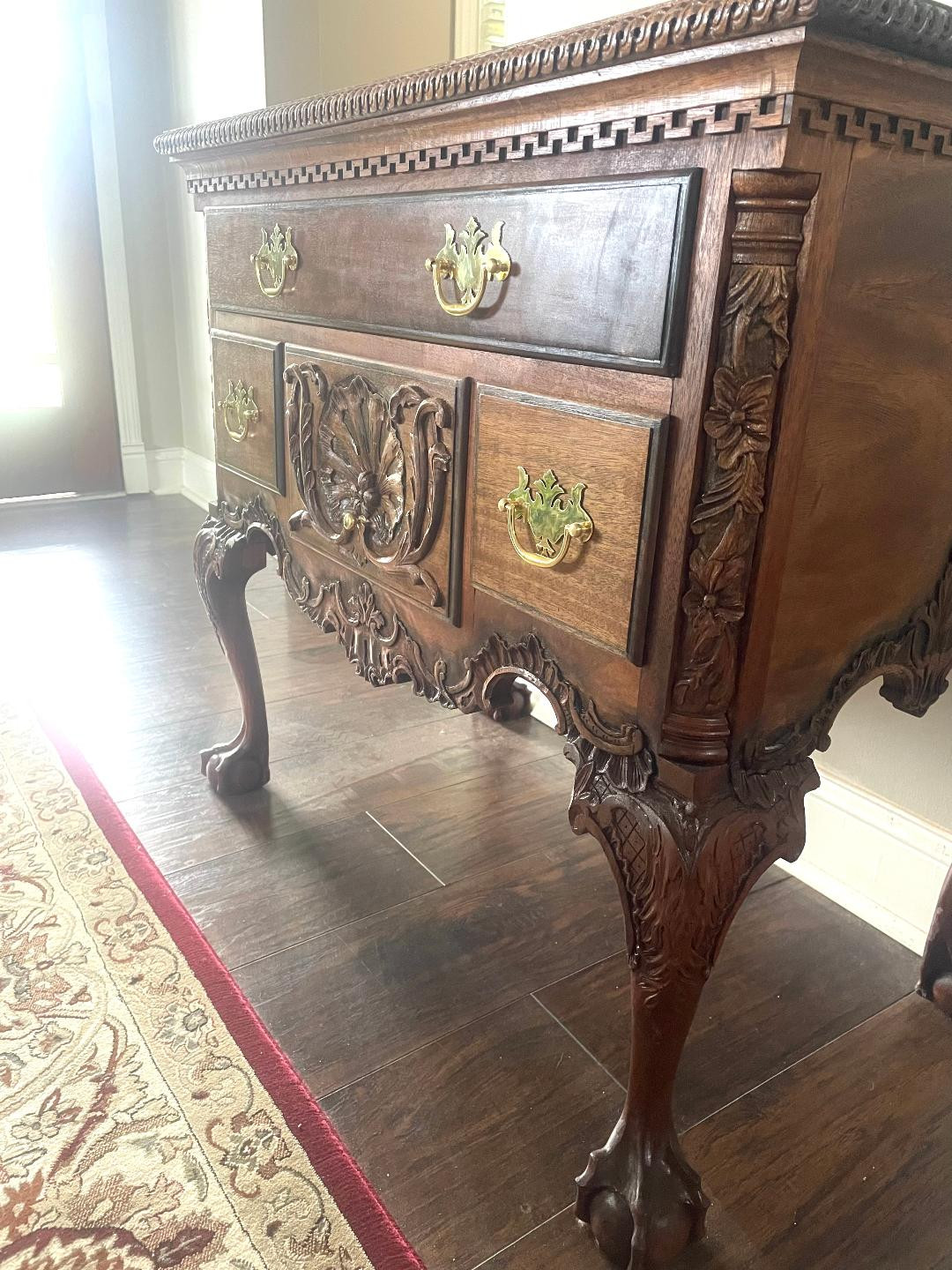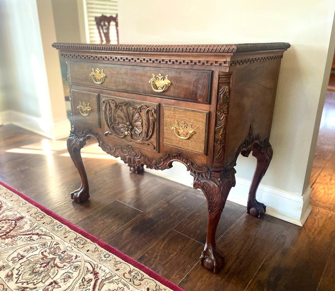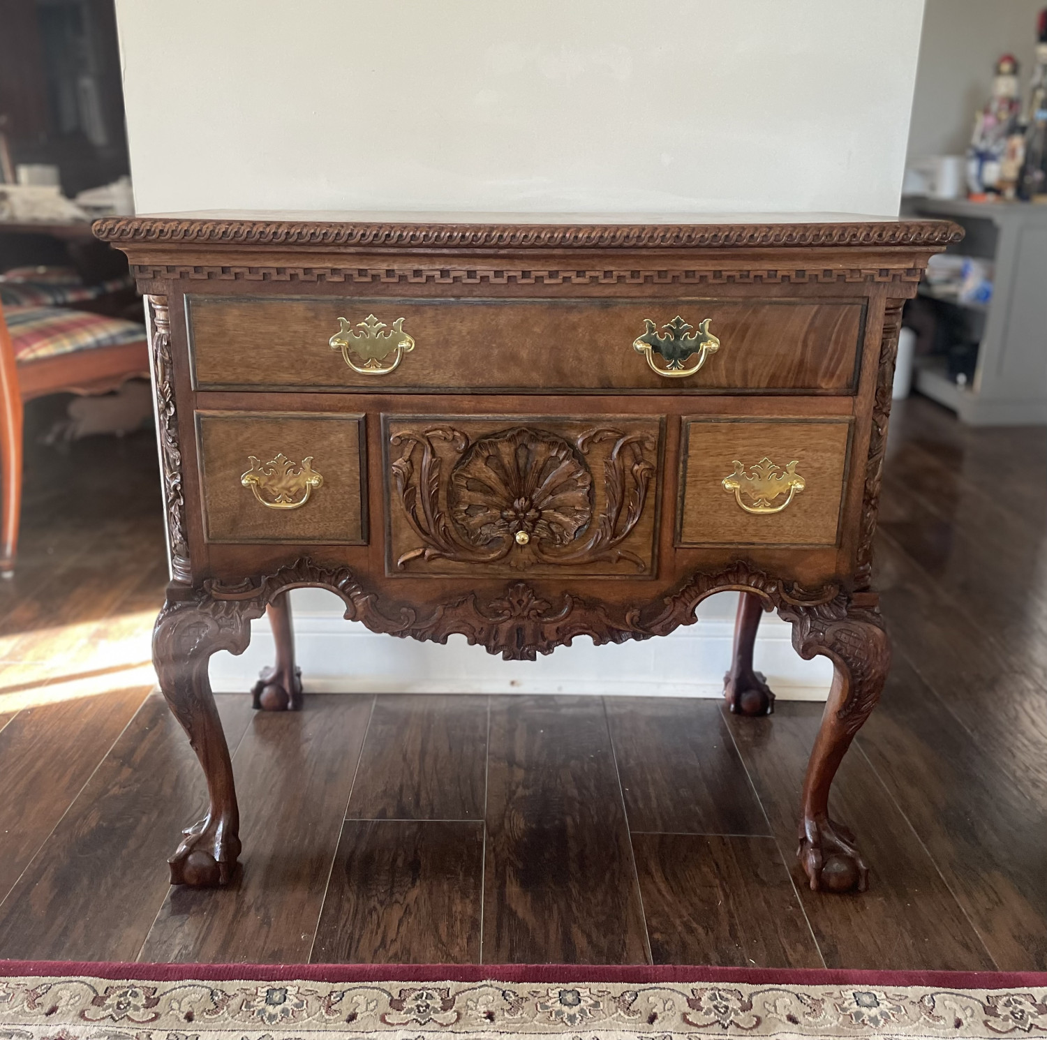 A Chippendale Garvan Carver Dressing Table made of Mahogany, Poplar and White Ppine as secondary and Brass finished with a Custom Dye Stain Mix, Sediment Glazing and Shellac. The dimensions are 32" H x 35" W x 20 1/2" D built in Pulaski, Tennessee.