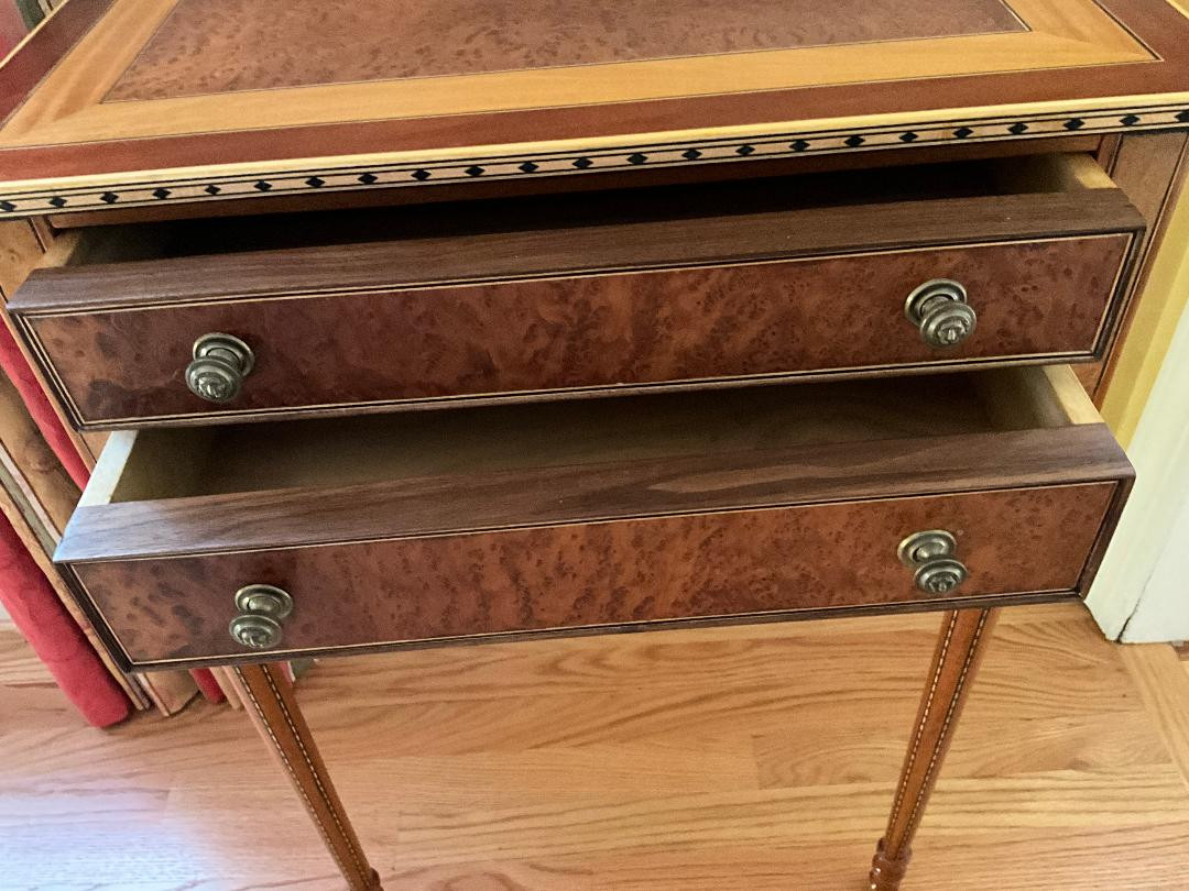 Veneer was applied with hide glue and includes redwood burl, satinwood and walnut on the top.