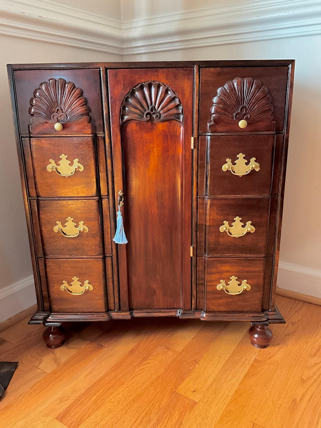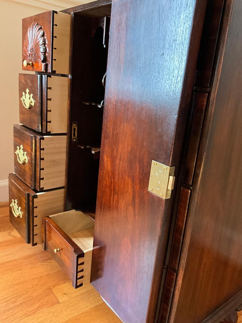 This John Townsend Document Chest of the Chippendale Period (1760), is made of Mahogany and Poplar secondary. It measures 27 1/2" H x 23 7/8" W x 11 3/4" D. Made in Goldsboro, Georgia.