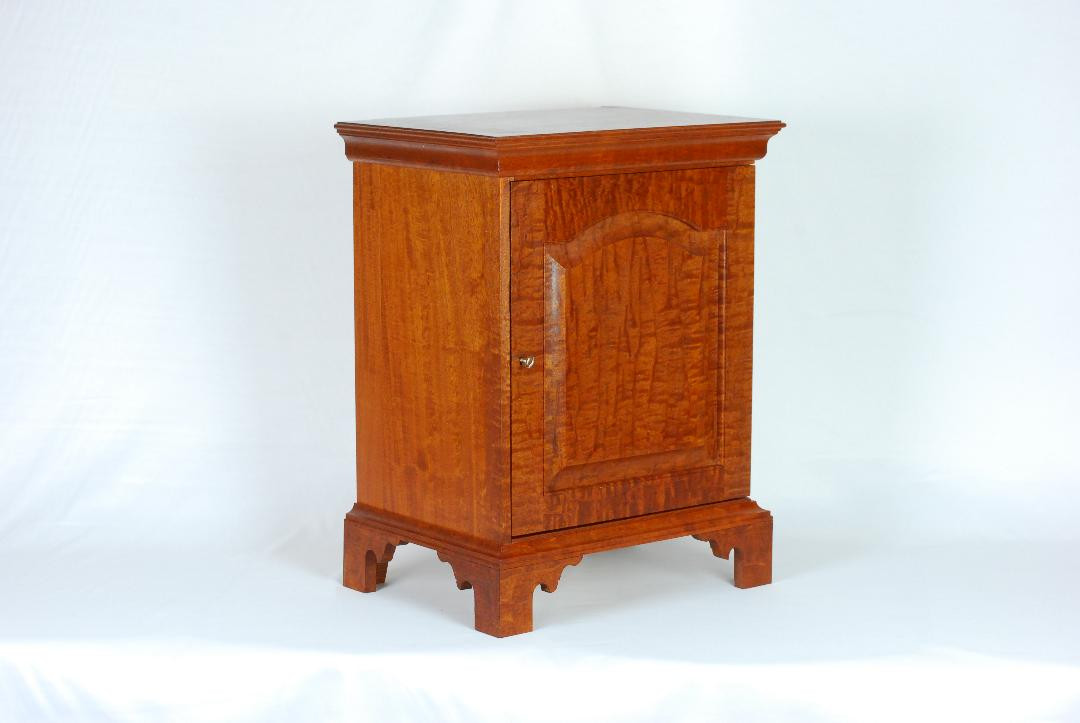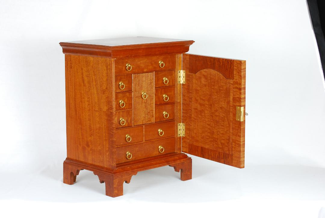 Hardware is Horton Brasses. The finish is multiple coats of brushed and padded clear shellac. Dimensions: 16.25” W x 21.25” T x 12” D.
